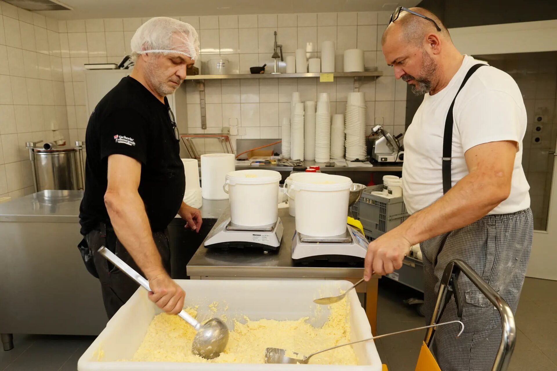 Im Bülacher Weiler Nussbaumen veredeln wir Fonduekäse aus der ganzen Schweiz zu 35 unterschiedlichen Mischungen. Das Trio, bestehend aus Oliver Oetjen, Sabrina Bernhardsgrütter und Miodrag Mlinarevic, packt kräftig mit an, um sicherzustellen, dass jeder Käse in ihren Fondues höchsten Qualitätsstandards entspricht.
