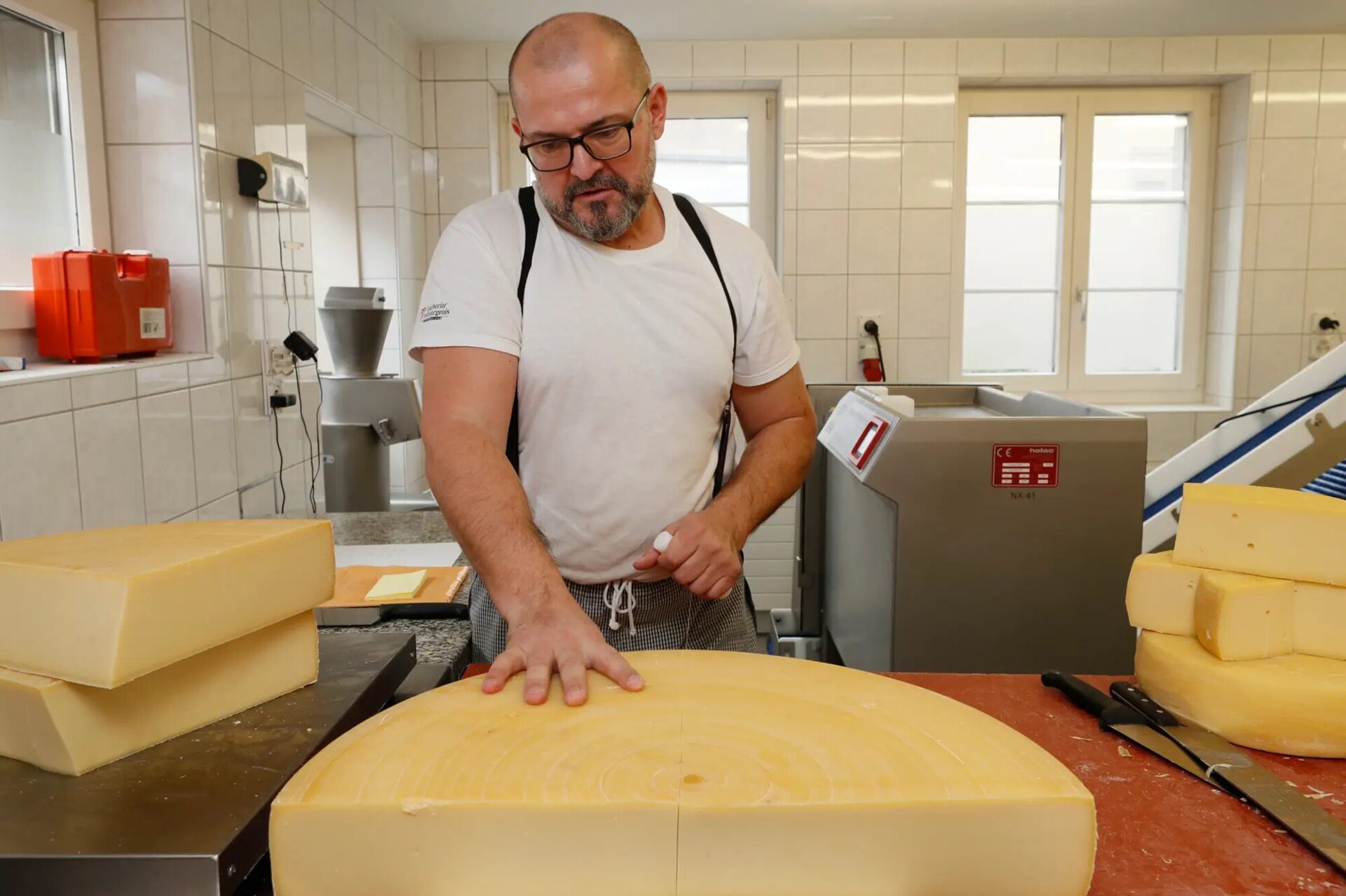 Miodrag Mlinarevic schneidet die Rinde vom Käselaib.